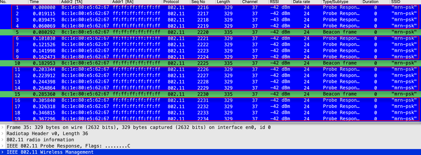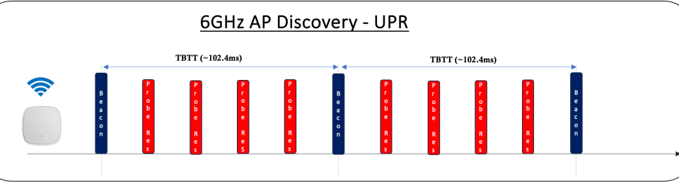 In this post, we’ll explore UPR- Unsolicited Probe Response, another “In-band Discovery” method utilized in the 6GHz operation. It’s similar to the FILS Discovery method. Instead of sending short FILS discovery frames, AP sends a Probe Response frame roughly every 20ms unsolicitedly (i.e. without waiting for clients’ Probe Request frames). Because it is a Probe Response frame, it includes nearly all the information fields found in the Beacon frame. This means that the management overhead will be much higher with this method compared to FILS. It’s almost as if Beacons are sent every 20ms