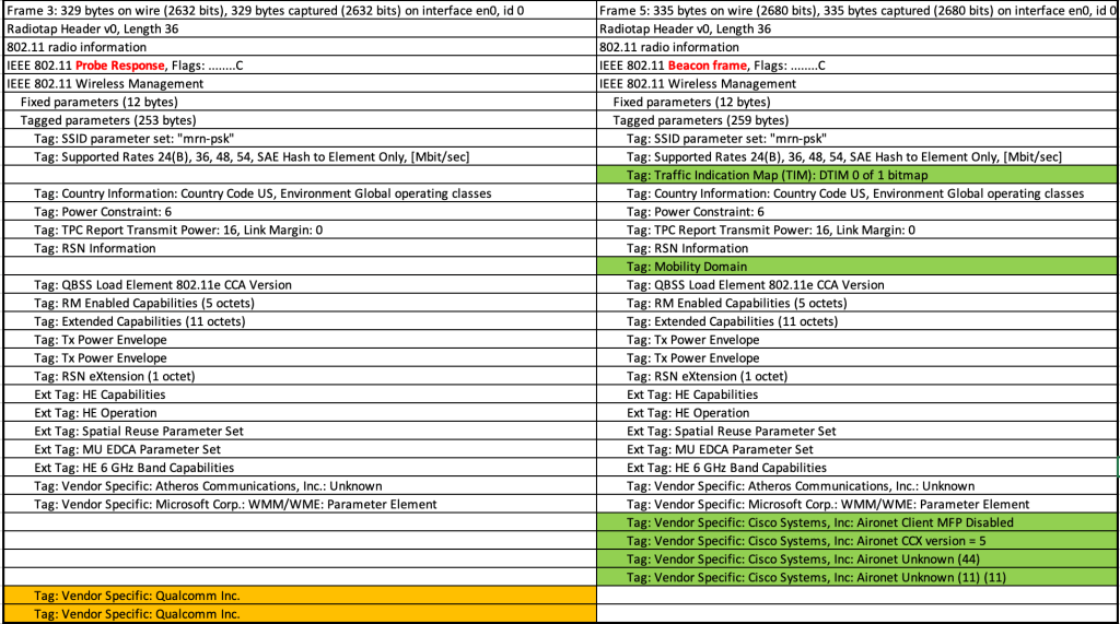In the capture above, If you look at the size of the Probe Response frame(329B), it is almost the same size as the Beacon frame (335B). You can simply compare the contents of Probe Response and Beacon frame (Copy > All Visible items in Wireshark) to identify the exact differences.
