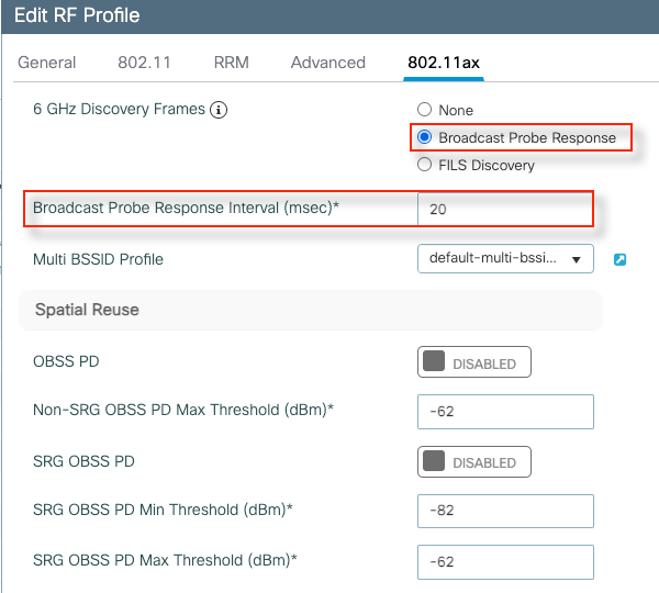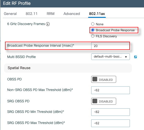 This time 6GHz RF profile is configured for “Broadcast Probe Response” which is sent every 20ms (default setting) once you enable it. That interval can be a value between 5-25ms in Cisco 9800 WLC.