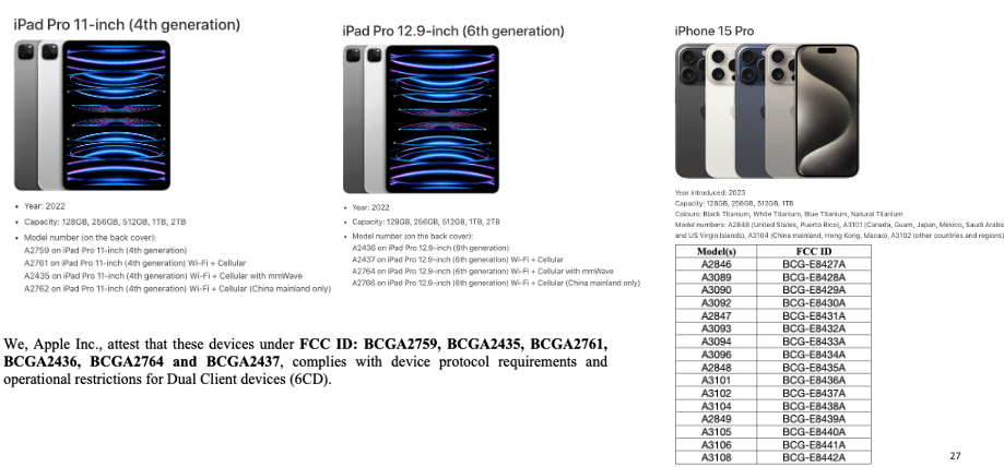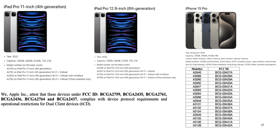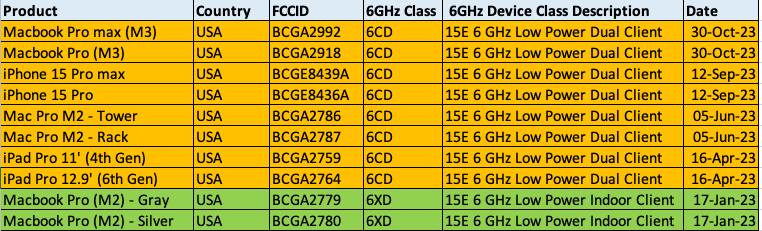 For Apple clients, you can use the link below. Sometimes, the Apple device model number closely matches the FCC ID. In certain cases, it may be different, and you have to find that mapping. By going through FCC documents, you may be able to find the answer. Here is the iPad Pro 6E device class confirmation.