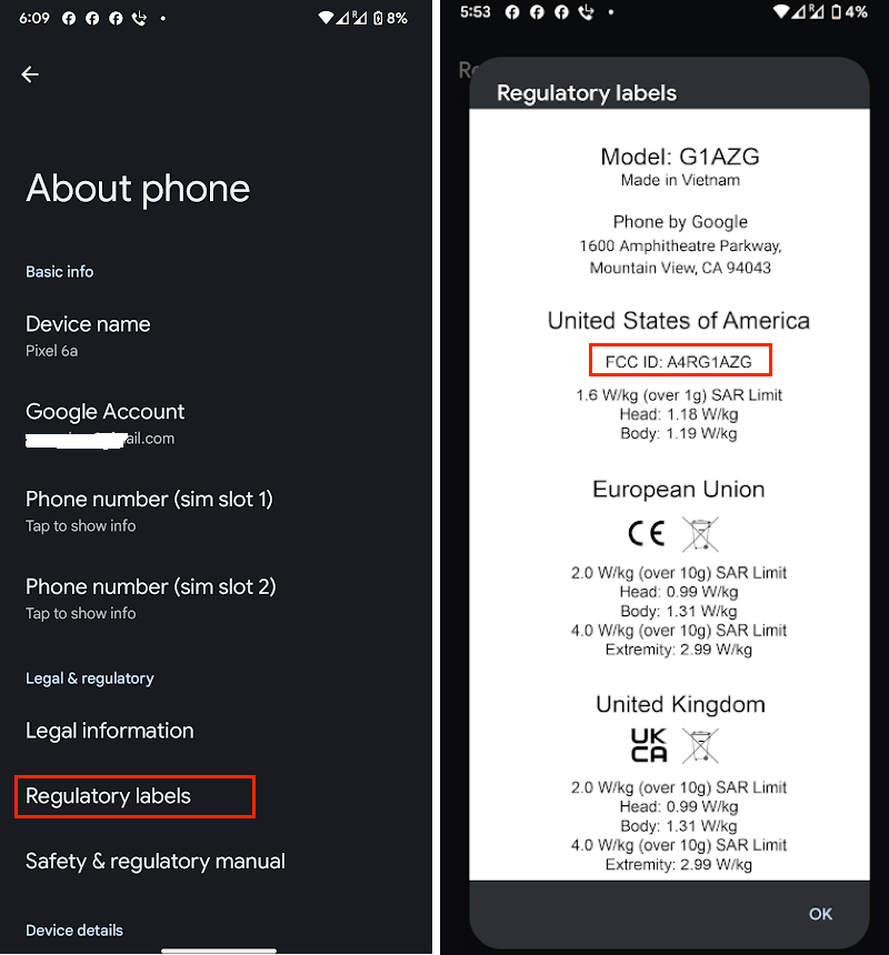 As you can see above, your 6GHz client can belong to one of the device types mentioned. When it comes to client devices, you need to check their capabilities. One way to confirm this is by examining the FCC certification details. If you have a 6GHz-capable device (certified by the FCC), you should be able to find its FCC ID as shown below. (For example, on a Google phone, go to Settings -> About Phone -> Regulatory Labels).