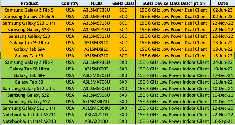 For Samsung clients, you can check it using the below link. You can see a lot of 6GHz capable Samsung devices and they are the first smartphone vendor to support 6GHz clients (so the list is long). Note that FCCID ends with “U” for US regulatory. If you replace that with “B” is for Global/International.