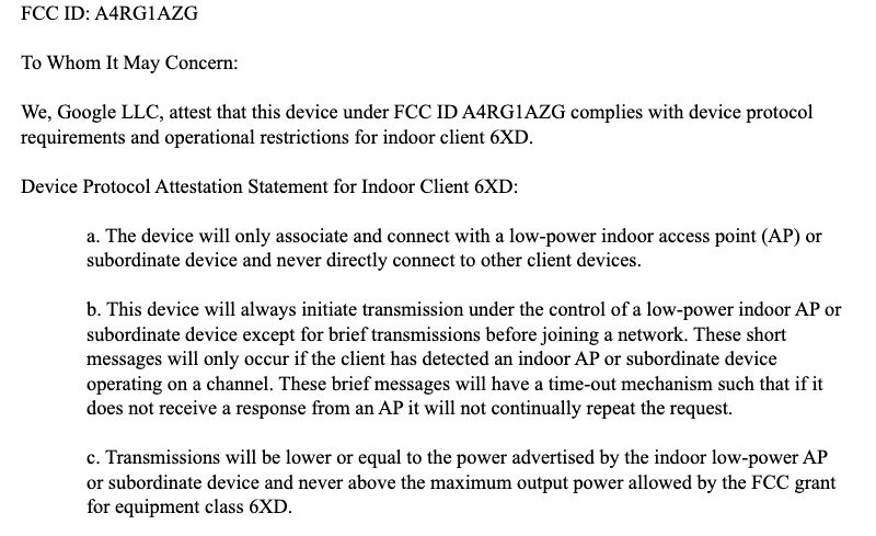 Next, you can visit the FCC ID search page (fccid.io) to find the details. Here is the extract from “A4RG1AZG_UNII 6GHz Attestation” document confirming its device class.