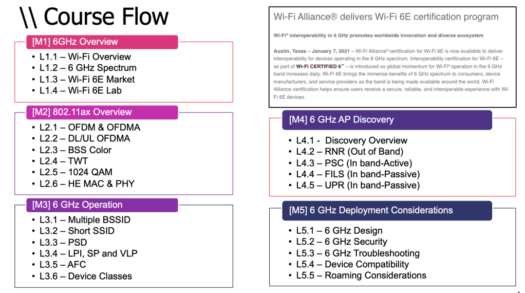 Here is my latest digital course at WiFi Training. Wi-Fi 6E lessons that cover what you need to know in this new 6GHz spectrum Wi-Fi deployment. Since there are different rules for various regulatory domains (Wi-Fi Alliance page is a good place to find them), it’s a good idea to get an overview of 6GHz deployment before bringing it on to your production environment.