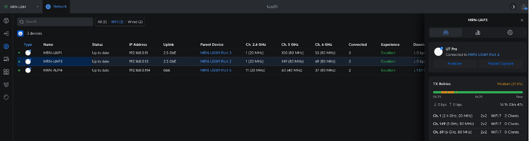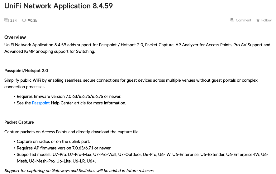 I have upgraded my home lab to Wi-Fi7 APs from UniFi (thanks to Darrel and the UniFi team for providing the hardware). UniFi introduced Wi-Fi packet capture capability (on radio interfaces or ethernet interfaces) in the recent UniFi release 8.4.59. This feature is supported on their Wi-Fi 7 and Wi-Fi 6/6E (U7 and U6 series) APs.