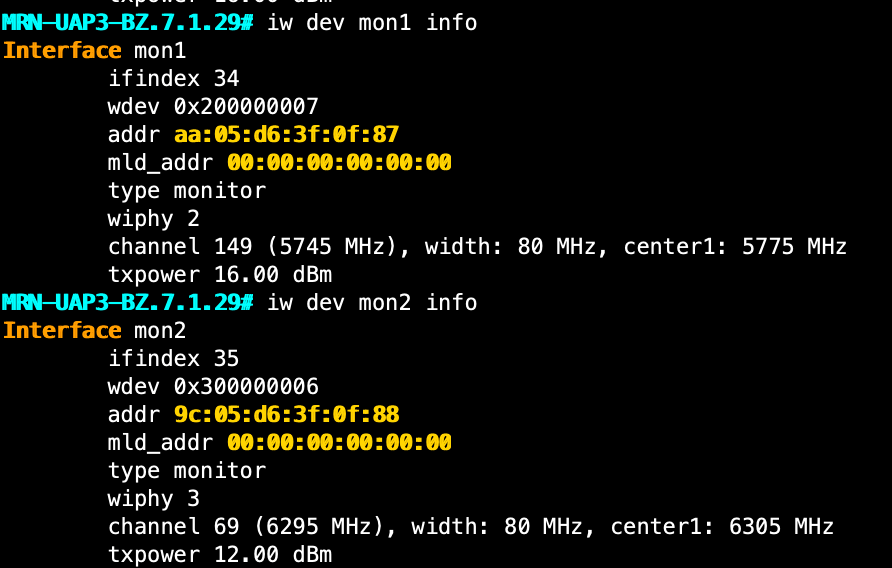 While capture is running, if you check the ‘mon1‘ and ‘mon2‘ interface info, you can see them as ‘monitor mode’ interfaces.