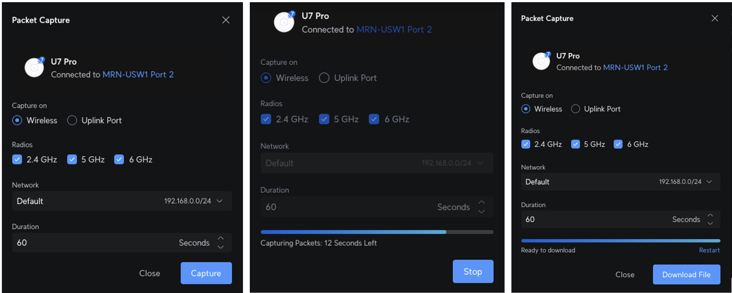 Once click ‘Packet Capture‘ you simply need to select capture on ‘Wireless‘ and choose the radio interfaces. I selected all three radios and set them for 60-second PCAP. Once the 60s expire it should show you the ‘Download File‘ option. If you do not see it, you may need to retake the PCAP (I had to do this a couple of times)
