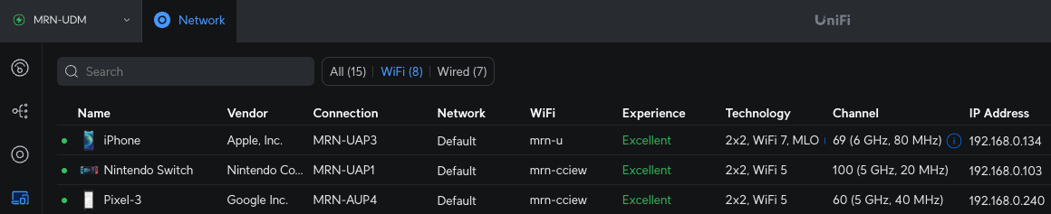 While the capture was running I connected ‘iPhone16’ to ‘mrn-u’ SSID which is configured for MLO (Multi-Link Operation). In my testing, I used the 8.5.6 release (with AP firmware 7.1.29 version) and you can read MLO supports on UniFi APs from this link. You can see the iPhone connected to my AP and showing MLO support.