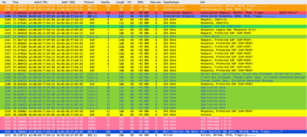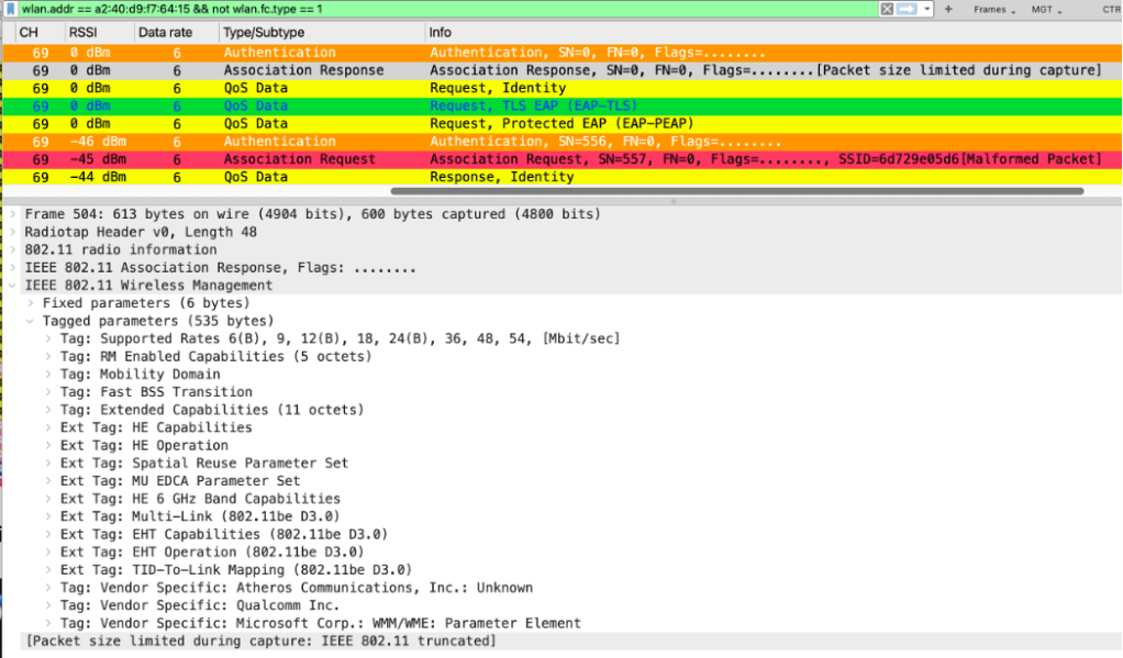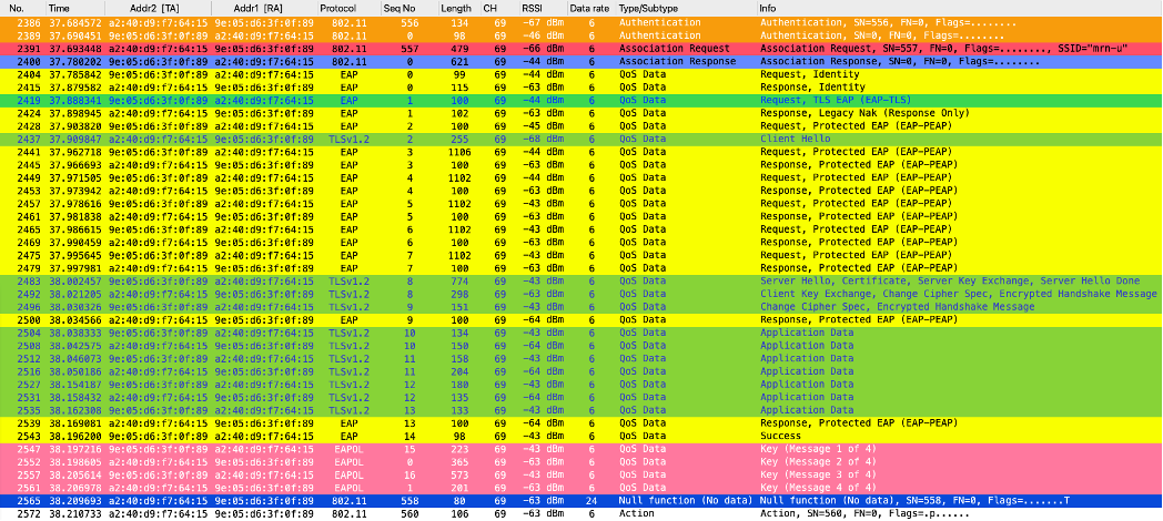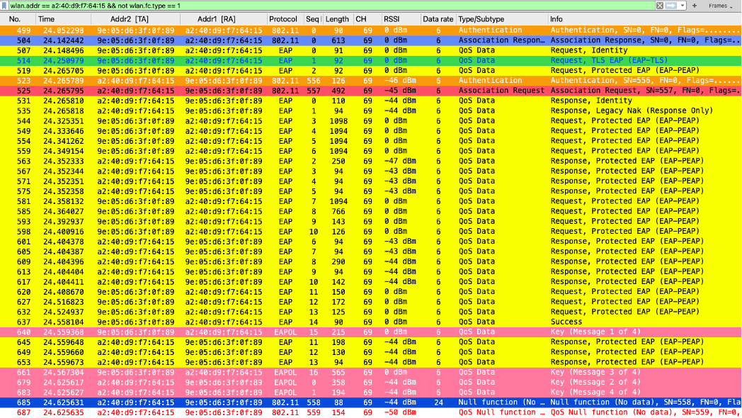 Here is the filtered traffic for my client’s MAC address and excluding control frames (wlan.addr == a2:40:d9:f7:64:15 && not wlan.fc.type == 1). As you can see it appears the order of certain frames is not quite right (opposed to Authentication -> Association -> 801.X/EAP -> 4-Way Handshake).