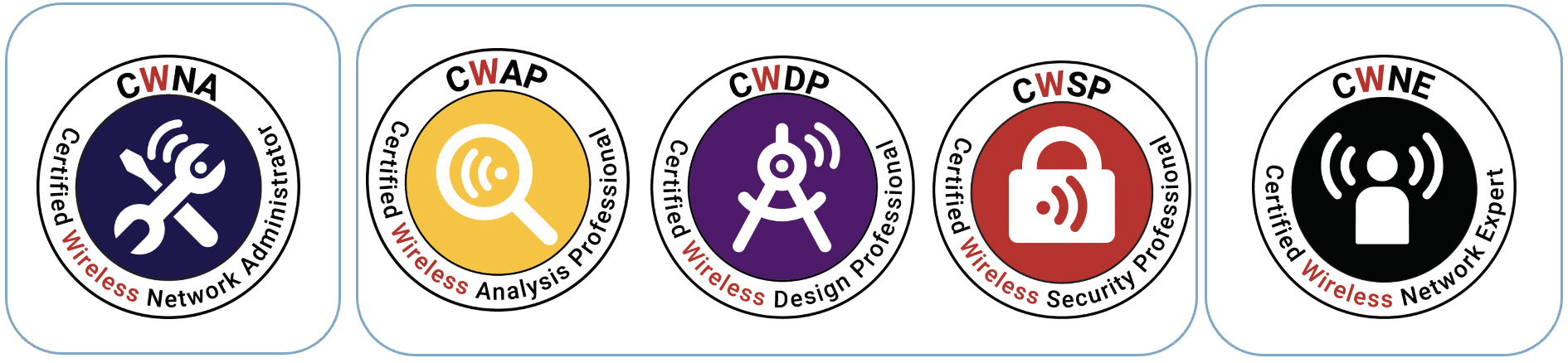 ACA, ACP, CCIE wireless, CWAP, CWDP, CWNA, CWNE, CWSP, ECSE-A, ECSE-D, ECSE-T, ENWLSD, ENWLSI, UWA, WLFNDU