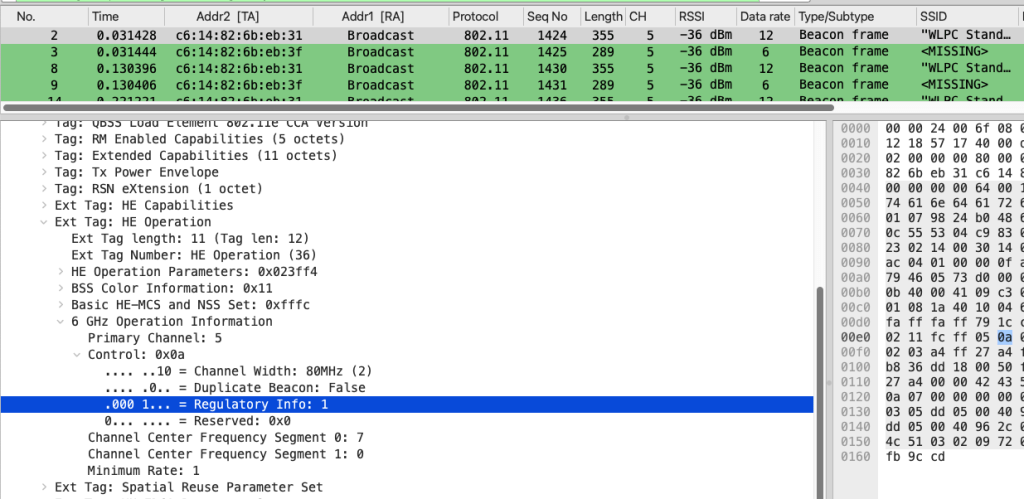Here is an example of SP – Standard Power AP operation where you can see regulatory info set to 1. Thank you to Scott and Doug for sharing some PCAPs that helped me understand it better.