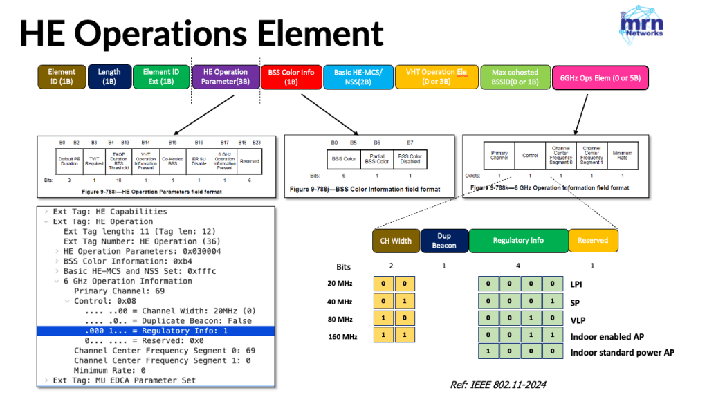 Operating mode of a 6GHz AP is included in the ‘Regulatory Info‘ subfield within the control field of the ‘HE Operation‘ element. If your AP supports 6 GHz, the HE Operation IE will include the ‘6 GHz Operation Element‘, which contains a control field where the Regulatory Info is specified. This field was expanded in the IEEE 802.11-2024 update to accommodate indoor-enabled APs, indoor standard-power APs.