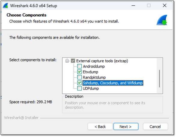 To enable remote Wi-Fi packet capture, make sure that when you install Wireshark on your Windows computer, you select the checkbox for ‘sshdump, ciscodump, and wifidump,’ as shown in the image below.