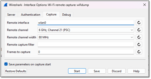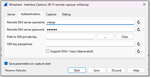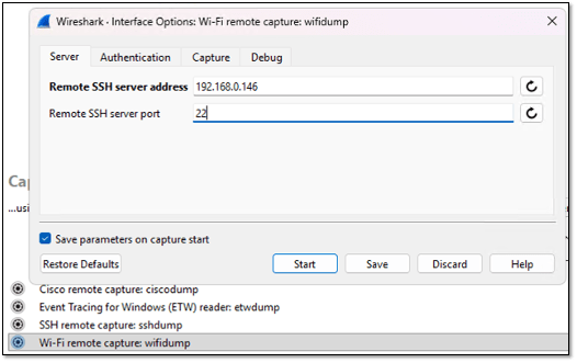 Once you open Wireshark and go to Capture Options (or use the shortcut Ctrl + K), you’ll see several options. Click on ‘Wi-Fi Remote Capture: wifidump’, then select the cogwheel icon to enter the WLANPi details. In the Server tab, you enter the IP address of WLANPi and SSH port 22.