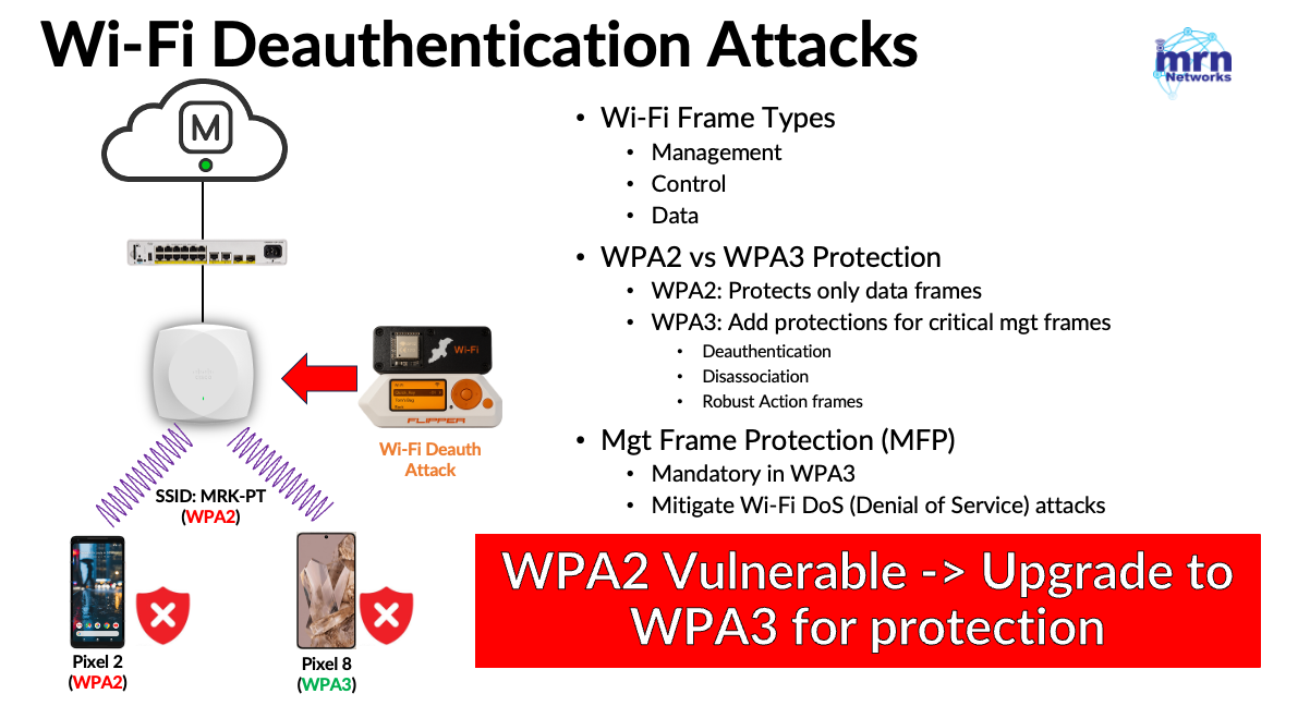Why? Because management frames in WPA2 are sent unencrypted, leaving your network vulnerable to spoofed commands. In this post, we’ll break down exactly how these attacks work, why WPA2 is exposed, and how WPA3 with Management Frame Protection (MFP) closes that gap forever. Check out the demo below to see the defense in action.