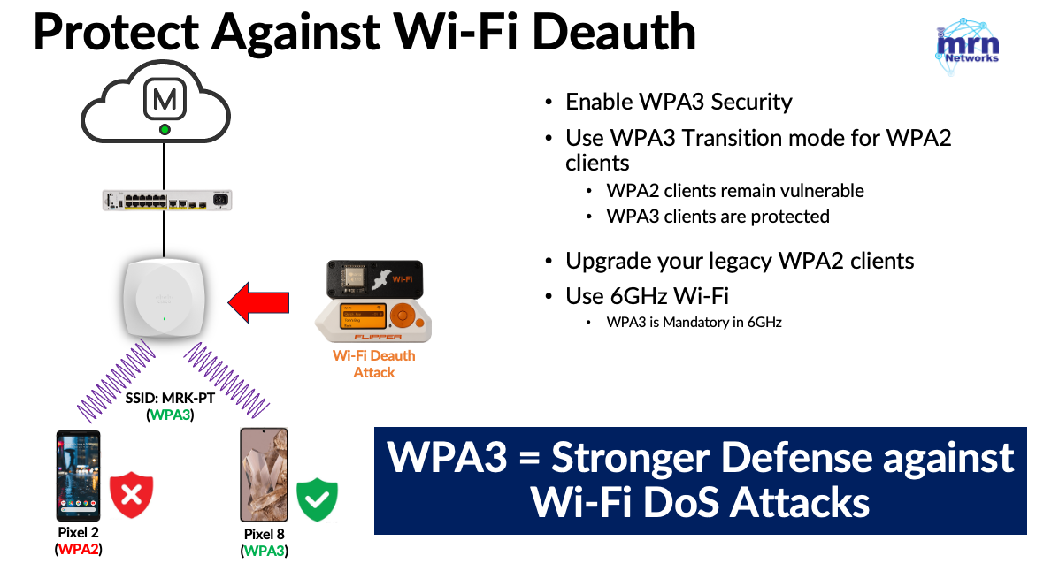 Implementing WPA3 ensures that critical management frames are secured: unicast frames are fully encrypted, while broadcast and multicast frames are protected with a Message Integrity Check (MIC). If your network needs to support legacy WPA2 devices, WPA3 must be deployed in Transition Mode (SSID is configured with WPA2 + WPA3). This allows WPA3-capable clients to benefit from enhanced protections; however, deauthentication attacks remain effective against many WPA2 clients because Management Frame Protection (MFP) is optional in WPA2 and unsupported by many legacy devices. WPA3 mitigates this by requiring MFP.