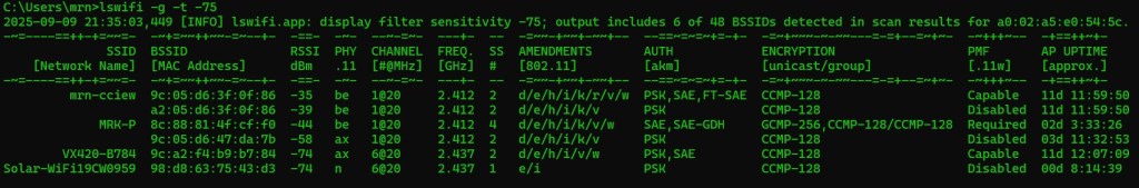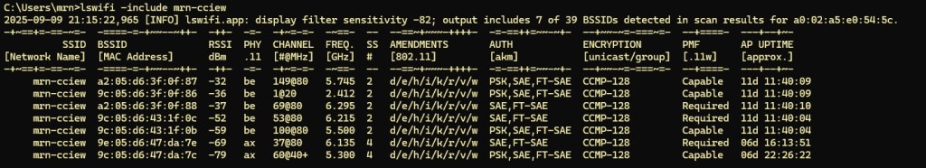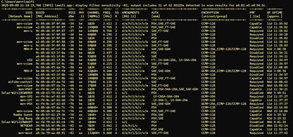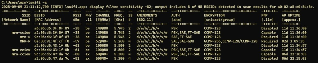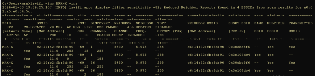 Once installed (watch the video above for a step-by-step guide), you can use the Windows CLI prompt to gather information about your Wi-Fi environment using the lswifi command. This will display all amendments supported by each SSID along with specific security configuration settings, including a detailed decode of the RSN element—such as AKM, unicast, and broadcast ciphers.