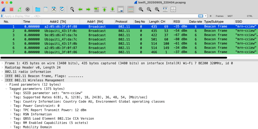 You can use the -rnr option to learn more about RNR element information. In the example below, you can see that the 2.4 GHz and 5 GHz radios advertise their 6 GHz SSID details on channel 5 with 80 MHz bandwidth. Based on the AP MLD ID and link ID, you can identify Wi-Fi 7-specific details for those links (0 = 2.4 GHz, 1 = 5 GHz, and 2 = 6 GHz in a Meraki AP).