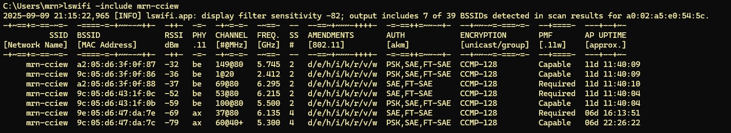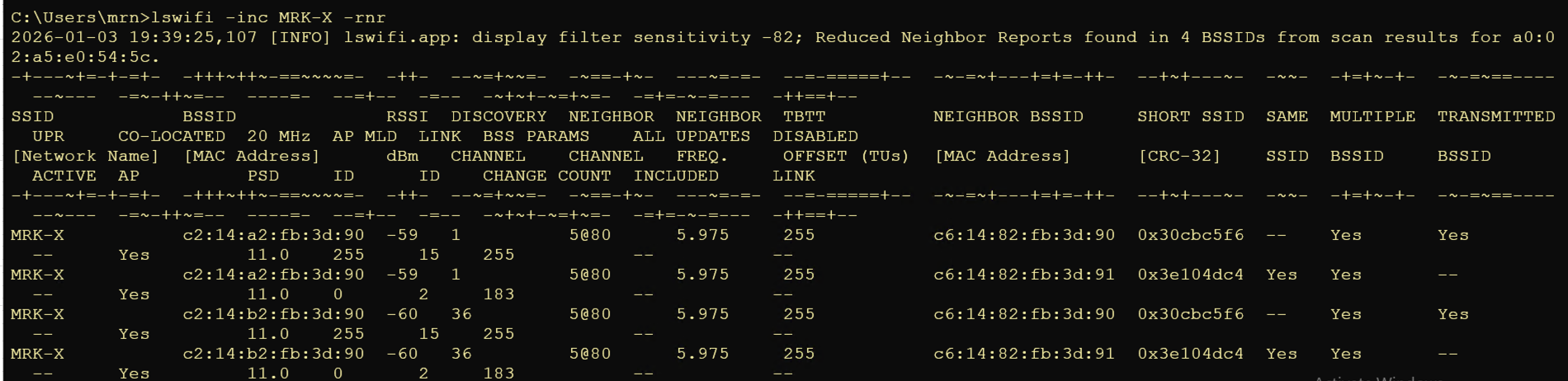 Once installed (watch the video above for a step-by-step guide), you can use the Windows CLI prompt to gather information about your Wi-Fi environment using the lswifi command. This will display all amendments supported by each SSID along with specific security configuration settings, including a detailed decode of the RSN element—such as AKM, unicast, and broadcast ciphers.