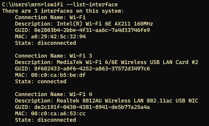 You can use the --list-interfaces option to display details of all your Wi-Fi interfaces