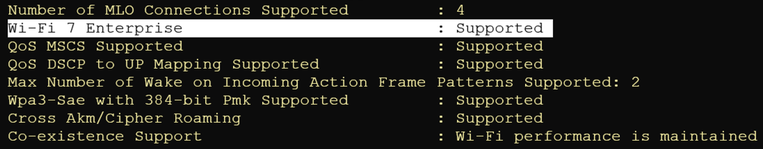 When you run ‘netsh wlan show wirelesscapabilities‘ you should see whether your Windows OS supports Wi-Fi 7 with Enterprise security. For example, on my Windows 11 25H2 system with an Intel BE200 Wi-Fi adapter, it shows support for Wi-Fi 7 Enterprise.