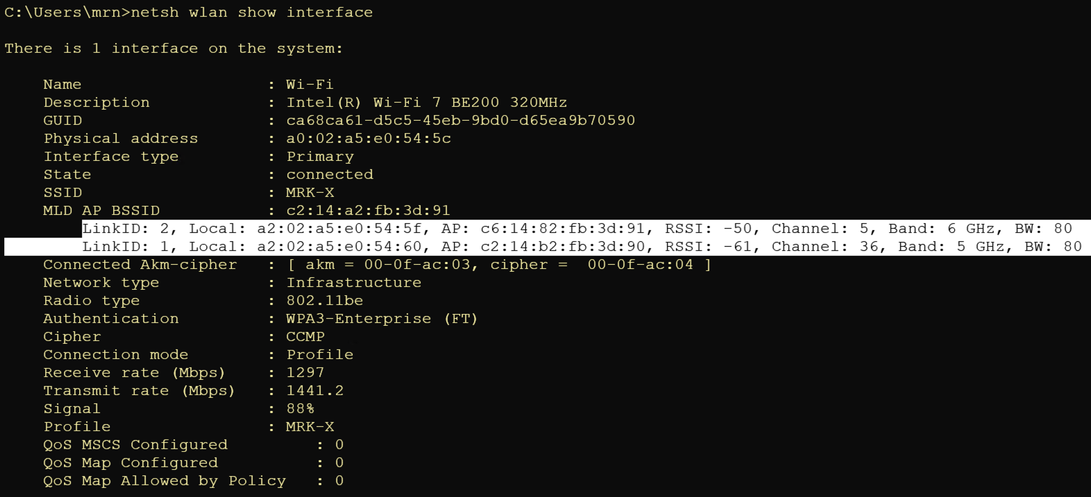 Here is the PCAP file (MRK-BE200-WPA3E.pcap) captured during my Windows 11 client connecting to a Meraki Wi-Fi 802.1X SSID. You can see that the BE200 adapter establishes an MLO association over both 5 GHz and 6 GHz bands, uses AKM:3 (FT over 802.1X), and employs CCMP-128-AES as the encryption cipher. Although the Wi-Fi Alliance recommends that client devices prefer GCMP-AES-256, current support is limited to CCMP-AES-128.