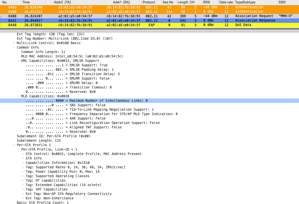 In Association Request frame, under Common Info, MLD capabilities you will see ‘Maximum number of Simultaneous Links‘ value of zero. This field Indicates the maximum number of STAs affiliated with the MLD that support simultaneous transmission or reception of frames on the respective links. A value of 0 means that even though an MLO connection is established over two links, simultaneous transmission or reception across both links is not possible. This means Intel BE client is a single-radio device, and you can see that it supports EMLSR under the EML Capabilities element.