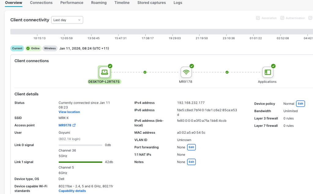 In Meraki dashboard as well, you can client associate across two links and only one link is active (CH5 on 6GHz)