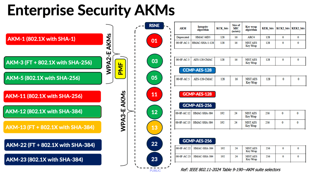 Here are the Enterprise security AKMs. The only difference between WPA2 and WPA3 Enterprise security is the requirement for MFP/PMF (Management Frame Protection); AKM 3 and AKM 5 are still used in WPA3‑Enterprise.