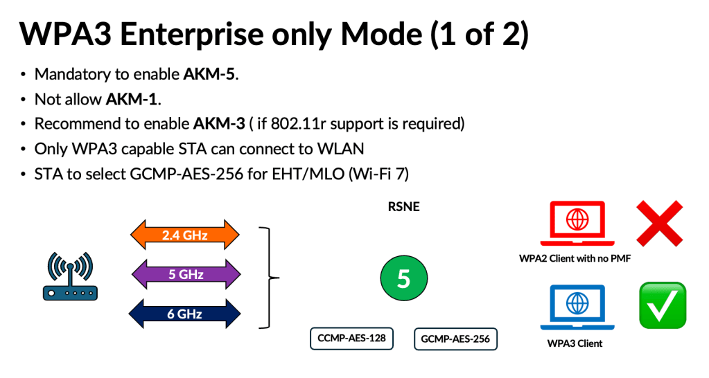 Because WPA3 uses the same AKMs (3 and 5) with PMF enabled, this mode does not introduce significant complications. However, depending on how AKM 22 and 23 are used in the future, they could lead to compatibility issues similar to those experienced with WPA3‑Personal. Here are some of the challenges highlighed in my presentation.
