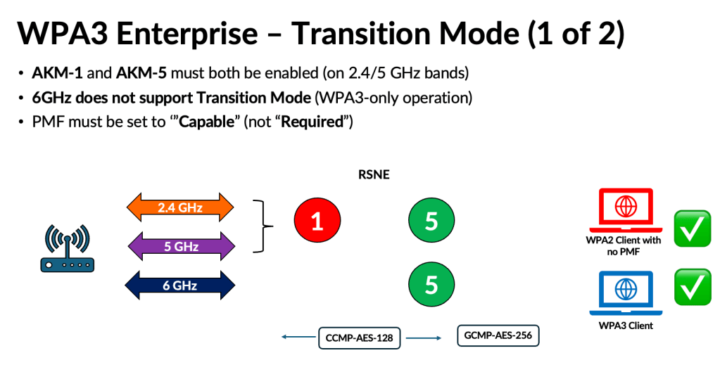 There are three deployment options available, with the most practical being WPA3‑Enterprise Transition.