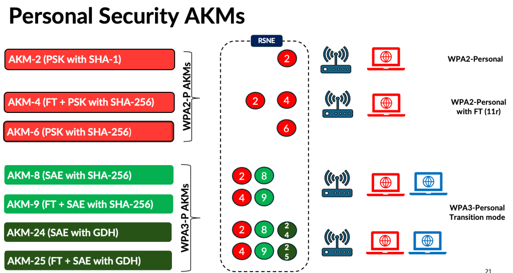 In WPA3‑Personal, new AKMs were introduced to address the vulnerabilities in WPA2‑Personal, along with the move to SAE authentication. With Wi‑Fi 7’s tightened security requirements, two additional AKMs (24 and 25) have also been introduced. As a result, transition‑mode deployments now require advertising more than two AKM suites, along with two cipher suites (CCMP‑AES‑128 and GCMP‑AES‑256). Below is the full list of Personal AKMs.