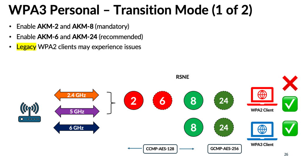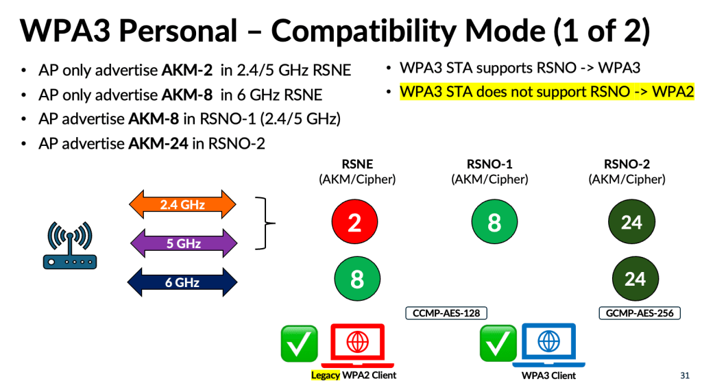 This led to the introduction of a new mode called WPA3‑Personal Compatibility, which keeps the RSN element limited to a single AKM (#2 – PSK with SHA1) and a single cipher suite (CCMP‑AES‑128), while introducing the newer AKMs through the RSN Override element (RSNO-1 and RSNO-2). This prevents legacy WPA2 clients from becoming confused. However, it also introduces a risk for WPA3‑capable clients that do not support RSNO. Since current WPA3 clients generally lack RSNO support unless vendors add it through firmware updates, those devices operating in the 2.4 GHz or 5 GHz bands may downgrade to WPA2 when it connect to WPA3-Compatibility mode SSID.