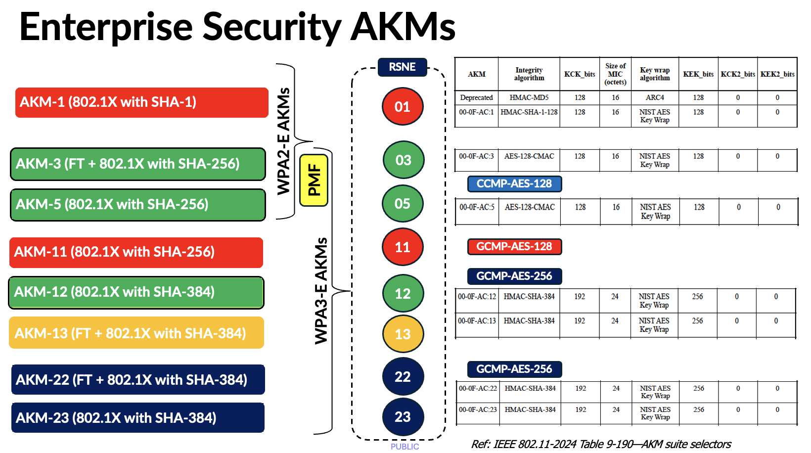 Here are the Enterprise security AKMs. The only difference between WPA2 and WPA3 Enterprise security is the requirement for MFP/PMF (Management Frame Protection); AKM 3 and AKM 5 are still used in WPA3‑Enterprise.