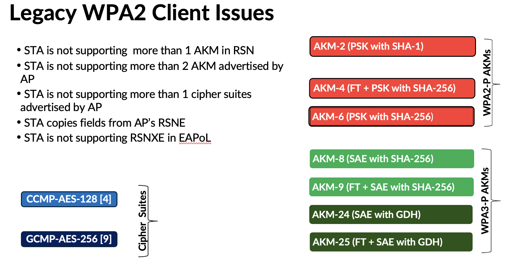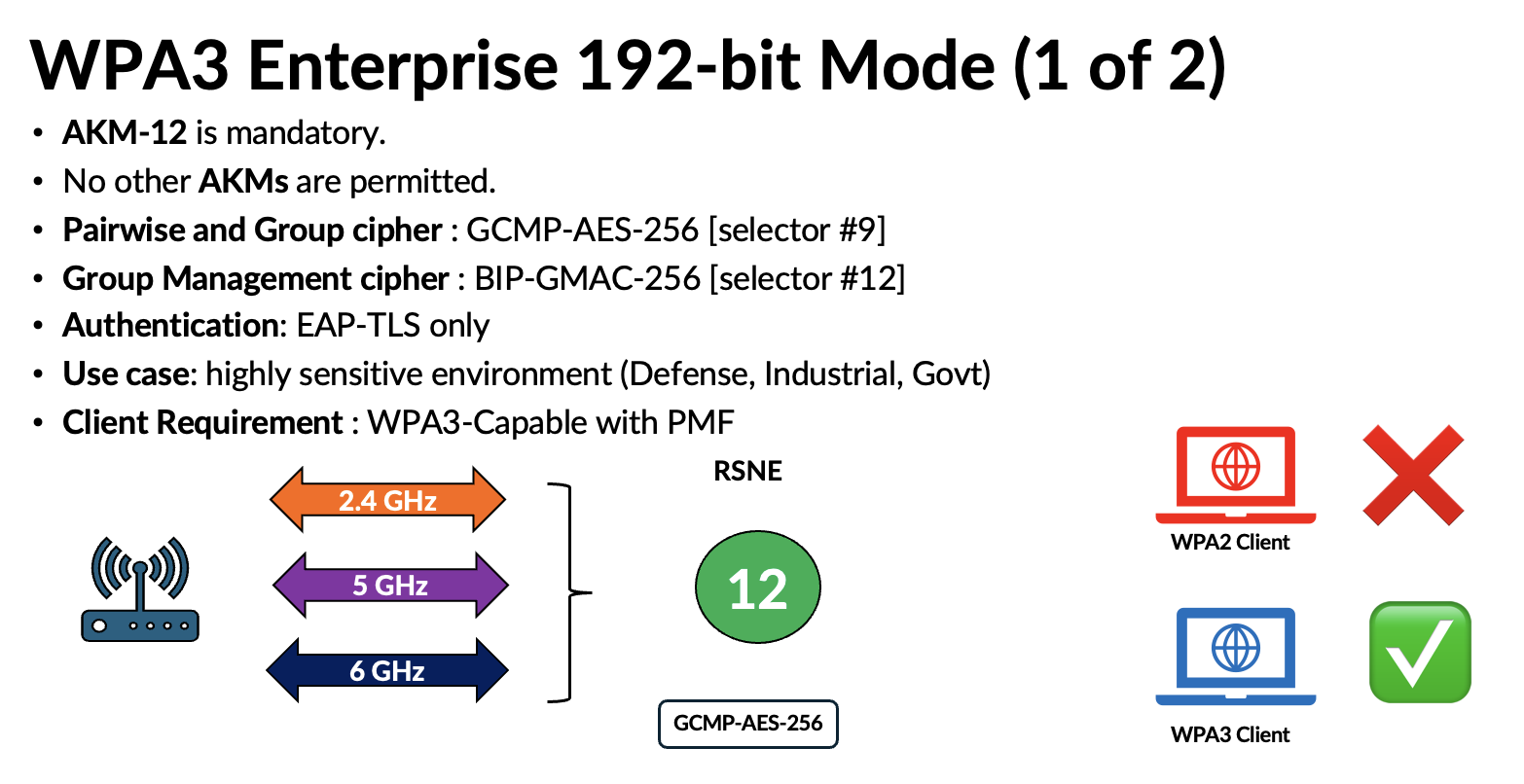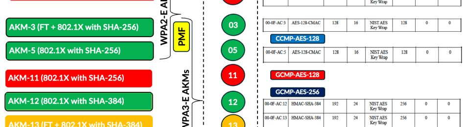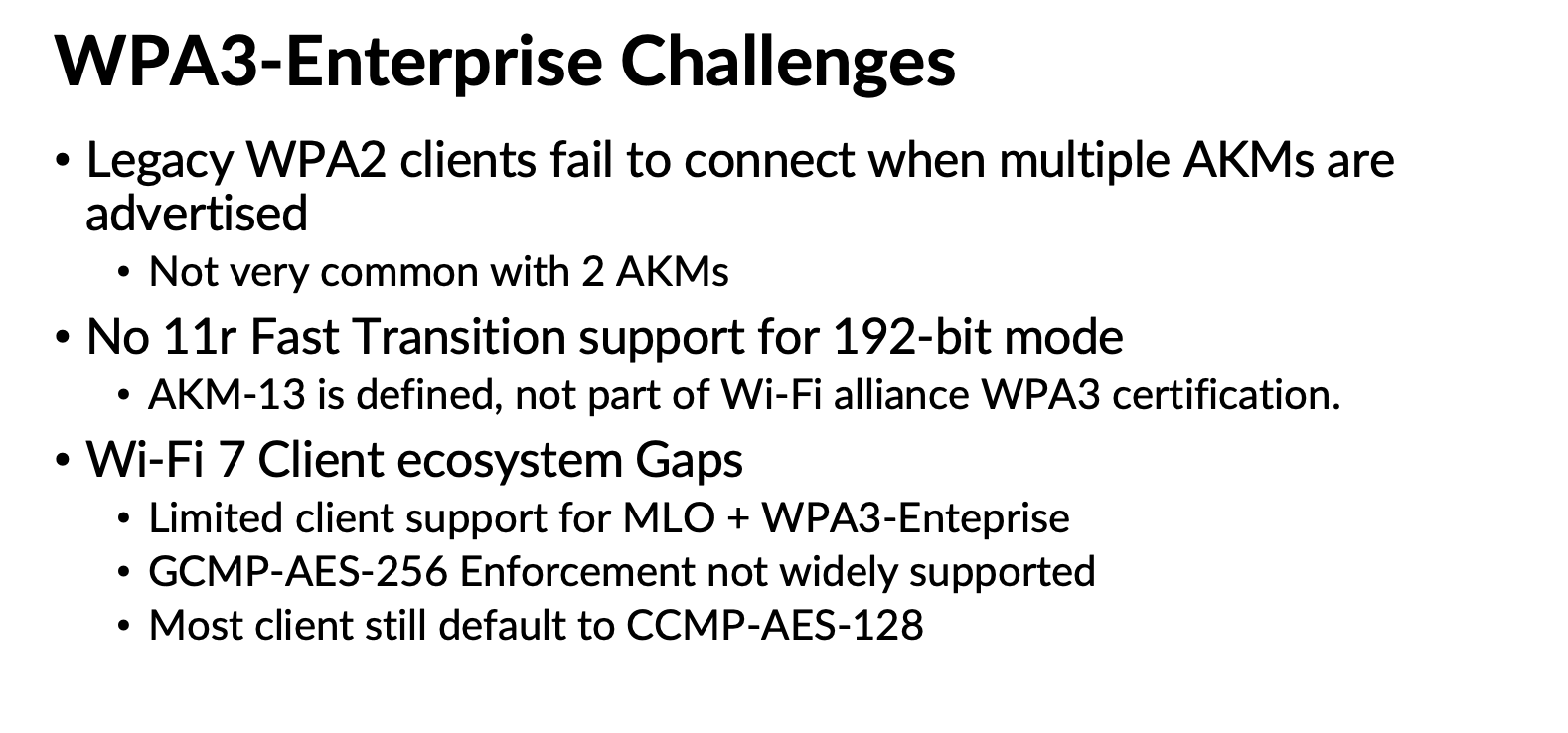 Because WPA3 uses the same AKMs (3 and 5) with PMF enabled, this mode does not introduce significant complications. However, depending on how AKM 22 and 23 are used in the future, they could lead to compatibility issues similar to those experienced with WPA3‑Personal. Here are some of the challenges highlighed in my presentation.