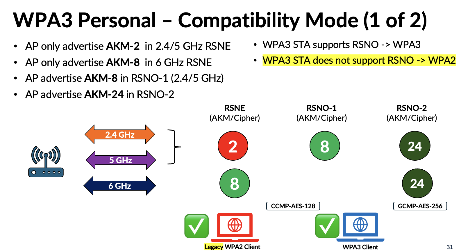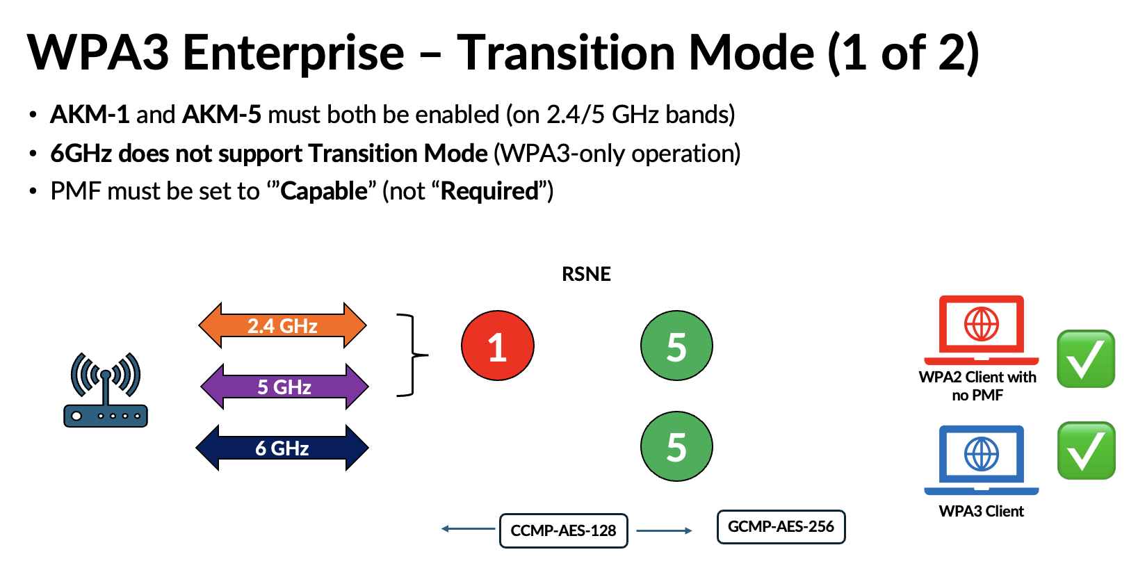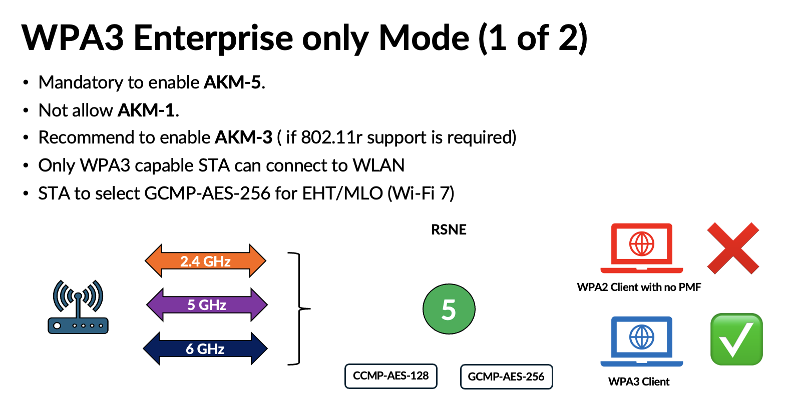 Because WPA3 uses the same AKMs (3 and 5) with PMF enabled, this mode does not introduce significant complications. However, depending on how AKM 22 and 23 are used in the future, they could lead to compatibility issues similar to those experienced with WPA3‑Personal. Here are some of the challenges highlighed in my presentation.