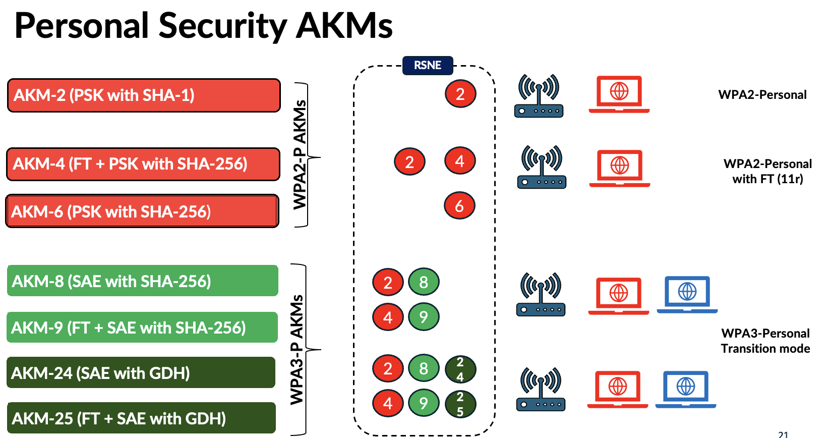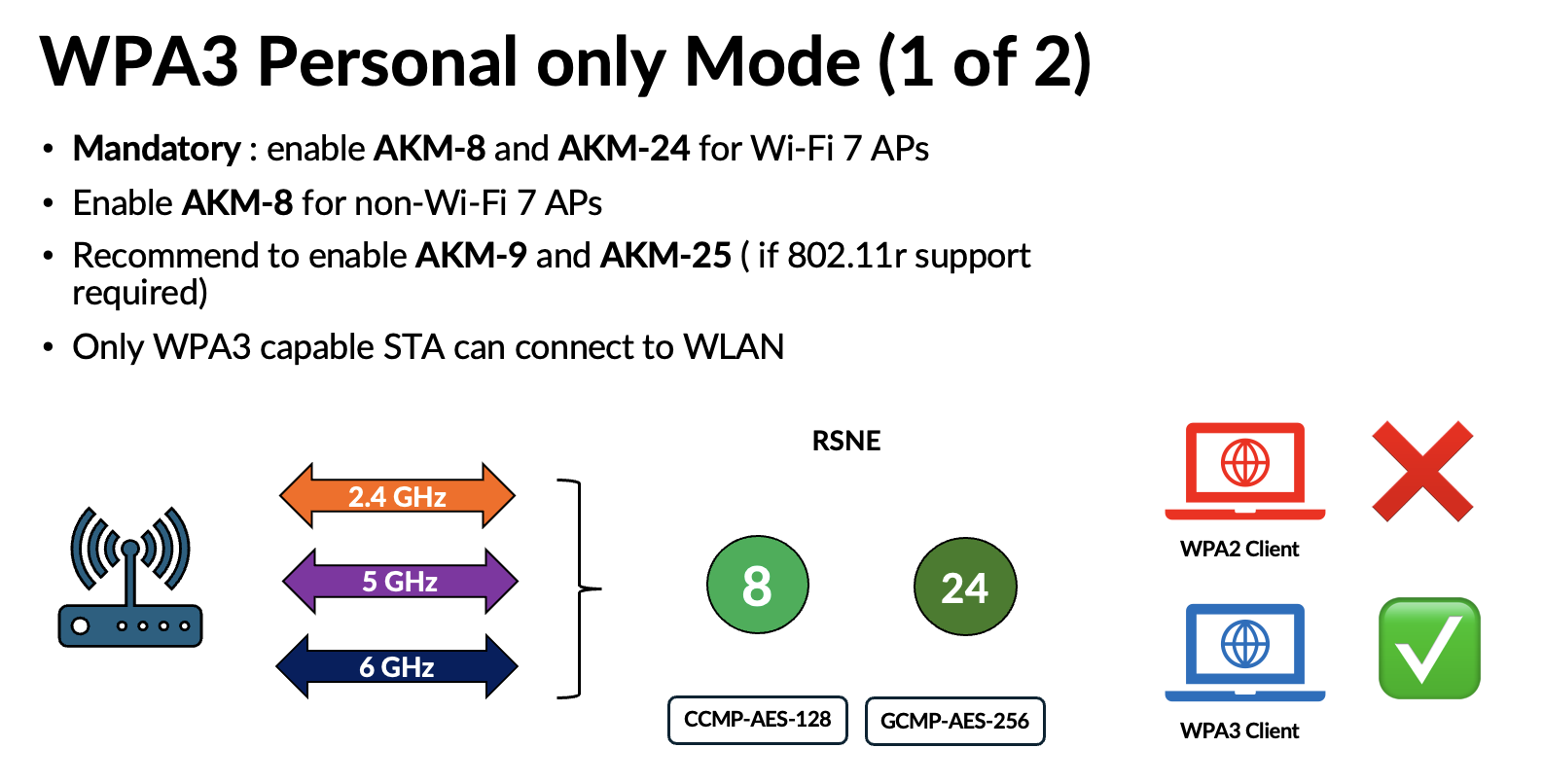In WPA3‑Personal, new AKMs were introduced to address the vulnerabilities in WPA2‑Personal, along with the move to SAE authentication. With Wi‑Fi 7’s tightened security requirements, two additional AKMs (24 and 25) have also been introduced. As a result, transition‑mode deployments now require advertising more than two AKM suites, along with two cipher suites (CCMP‑AES‑128 and GCMP‑AES‑256). Below is the full list of Personal AKMs.