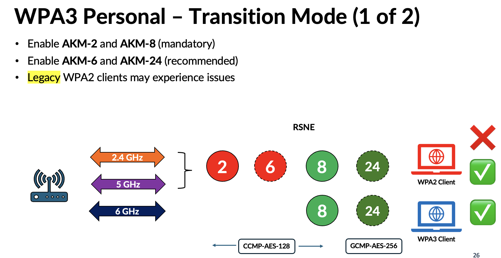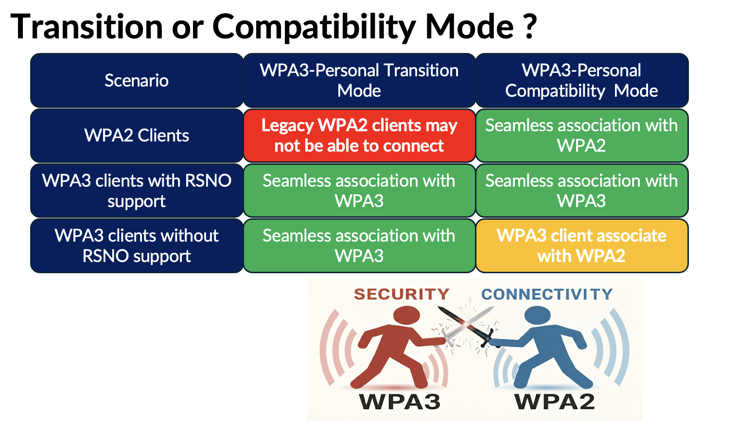If you need both WPA2 and WPA3 clients to connect, then WPA3‑Personal Transition mode is the right choice. However, although we expected legacy WPA2 clients to behave well when multiple AKMs and cipher suites were introduced, many older clients still experience compatibility issues.