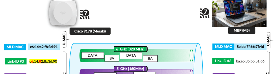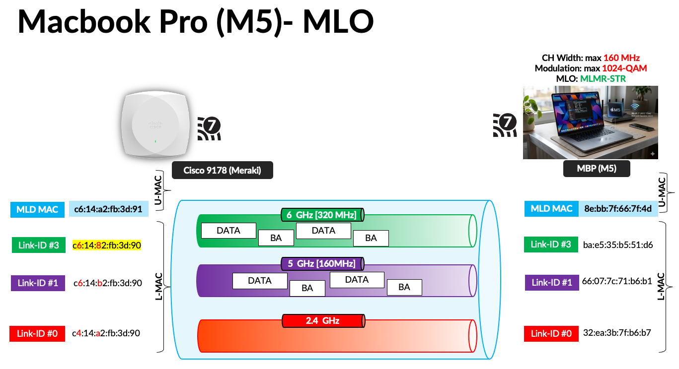 By referring to mcsindex.net, you can confirm that a data rate of 2402 Mbps corresponds to two spatial streams (2SS) using MCS 11 with a 160 MHz channel. In my testing with the Speedtest application, I did not observe the Apple client load‑balancing traffic across the 5 GHz and 6 GHz links. In my testing I have configured Cisco 9800 managed 9178 AP with WPA3-Personal SSID (mrn-PSK) for 5GHz and 6GHz (with 160MHz and 320MHz channel bonding).