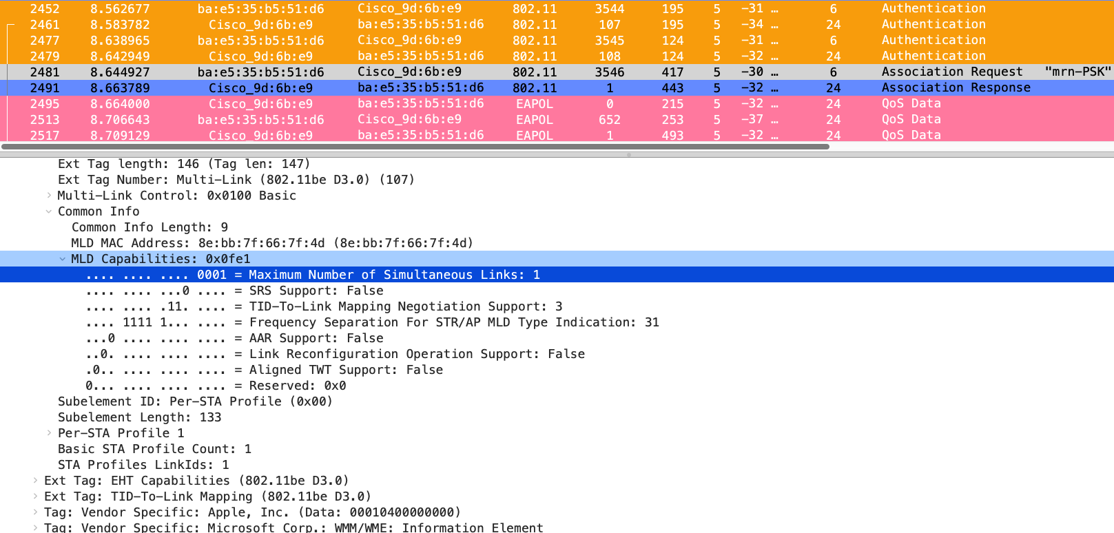 You can see Apple client indicating it is MLMR-STR capability with max simultaneous links value set to 1. (indicating it can send traffic across 2 links simultaneously)