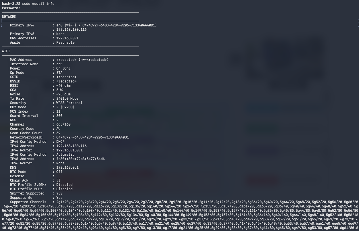 You can use the Apple Wireless Diagnostics Utility (wdutil) CLI command to get more detailed information about your MacBook’s Wi‑Fi interface. Here is a very good piece of documentation that explains it in detail. Open the Terminal app run ‘sudo wdutil info‘ to get the output shown below. PHY mode (0x200) is for 802.11be. Even though this output indicates support for Sniffer mode, note that the AirTool 2 application still does not work with the Apple N1 chip. As a result, you are limited in your ability to capture PCAP files using the AirTool application. Here is Adrian confirmation on a LinkedIn post.