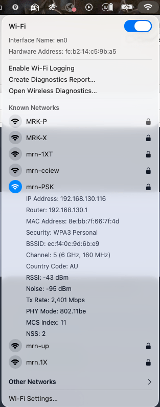 You can also get basic information by clicking the Wi‑Fi icon while holding the Option key. From here, you can view the MacBook’s MLD MAC address, PHY type, MCS index, and NSS details. You can see it is connecting using 802.11be, still no clear indication if that is MLO connection or not.