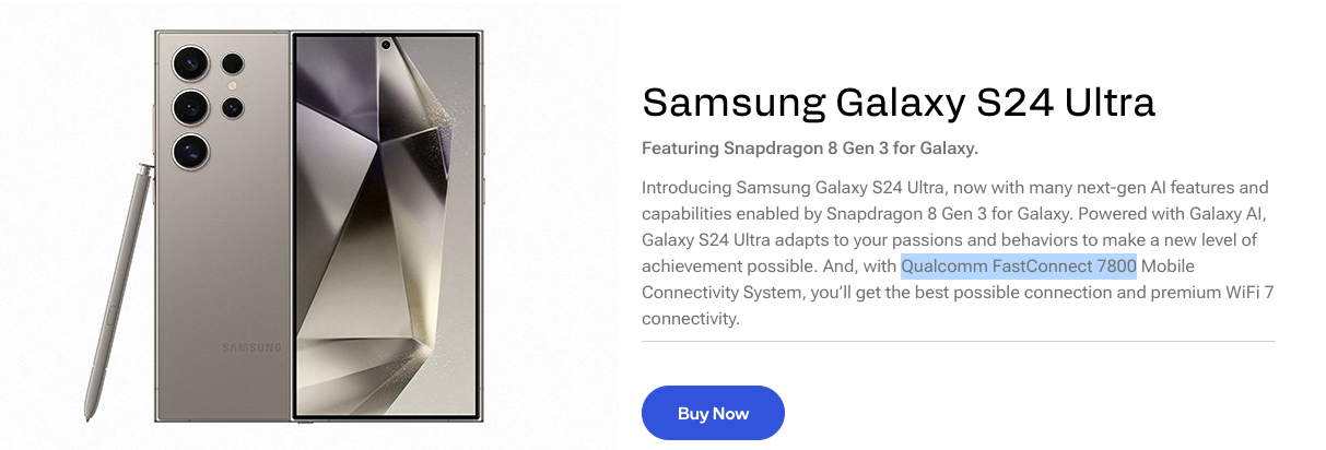 Continuing our series on evaluating the capabilities of different Wi‑Fi 7 clients, this post takes a closer look at the Samsung Galaxy S24 Ultra. The device is powered by the Qualcomm FastConnect 7800 chipset, which delivers full Wi‑Fi 7 capabilities, including 320 MHz channel support and 4096‑QAM. These capabilities can be verified through Qualcomm’s Device Finder page. This is the first Wi‑Fi 7–enabled smartphone in Samsung’s product lineup, and both the Galaxy S25 Ultra and S26 Ultra continue to use the same chipset. As a result, the overall Wi‑Fi 7 capabilities are not expected to change significantly across these models.