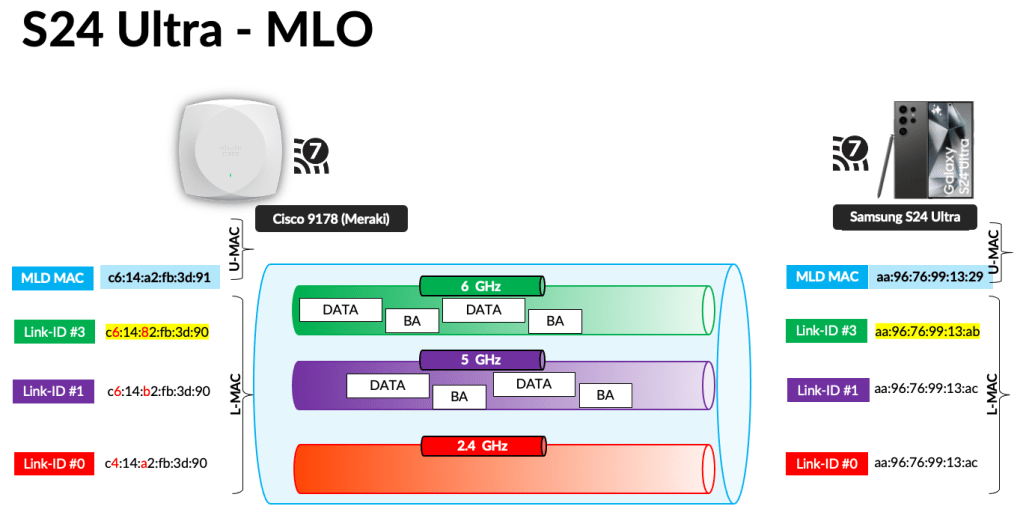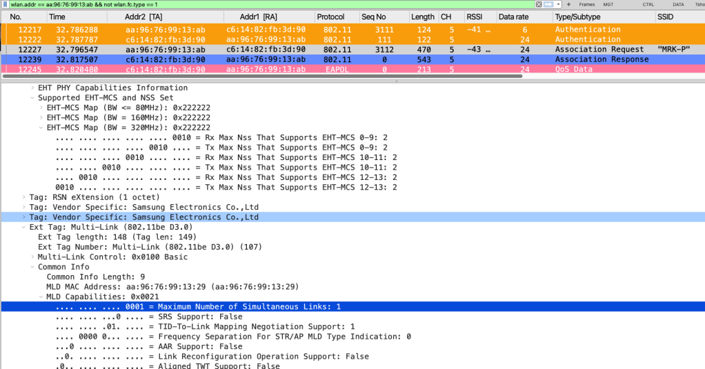 I believe this behavior is due to the availability of 320 MHz bandwidth on 6 GHz. When operating in this mode, the client may not aggregate traffic from additional links as part of MLO. As a result, the maximum PHY rate observed is 5.8 Gbps, which corresponds to MCS 13 (4096‑QAM) with a 320 MHz channel. You can filter S24Ultra traffic using wlan.addr == aa:96:76:99:13:ab && not wlan.fc.type == 1 of those two captures taken during my test.