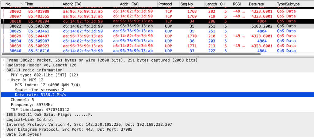 If you monitor the ‘Data rate’ column, you can find data frames transmitted over 5Gbps in this capture.