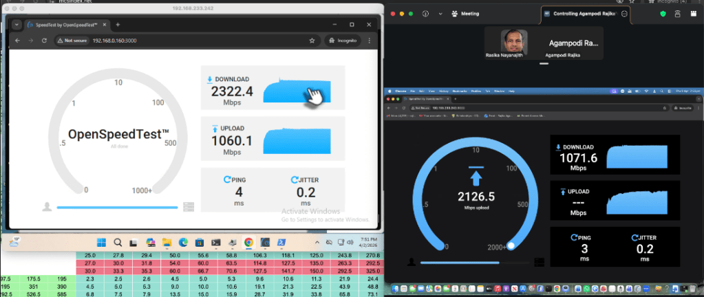 Both iPerf3 and OpenSpeedTest measured upload speeds of around 2.3 Gbps (from the UDB switch perspective). However, the download speed was unexpectedly limited to approximately 1.1 Gbps. At this stage, it’s not clear what caused this limitation—it could be related to the Windows client, the UDB switch, or another component in the setup.