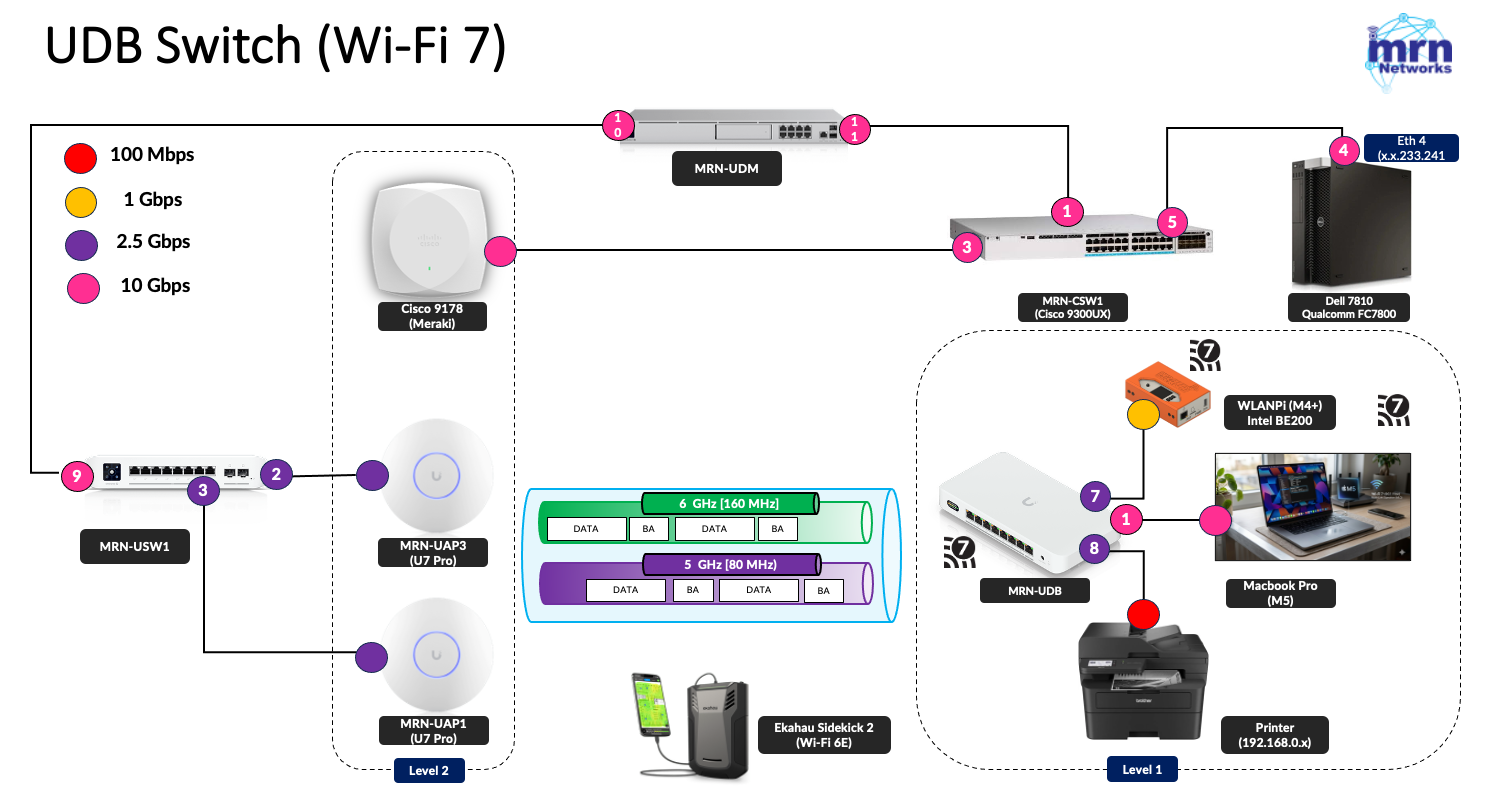 The access points are configured with 160 MHz channels in the 6 GHz (with 17dBm Tx power) band and 80 MHz channels in the 5 GHz band (with 14dBm Tx power). Theoretically, this configuration should provide a combined data rate of approximately 4.2 Gbps between the UDB switch and the Wi‑Fi 7 APs (based on 2.8 Gbps + 1.4 Gbps, as referenced from mcsindex.net).