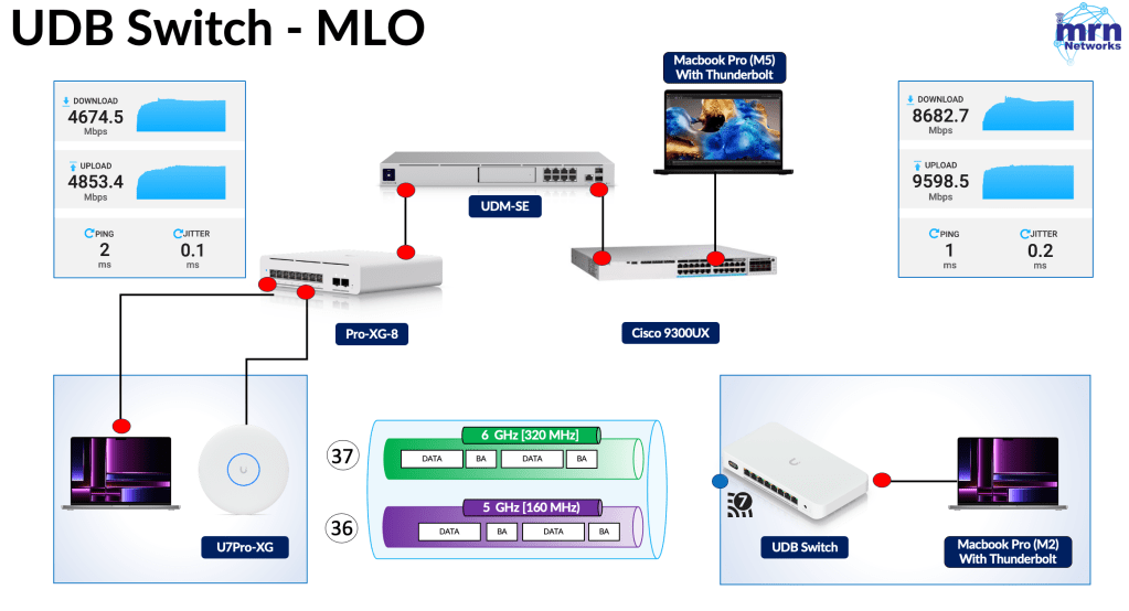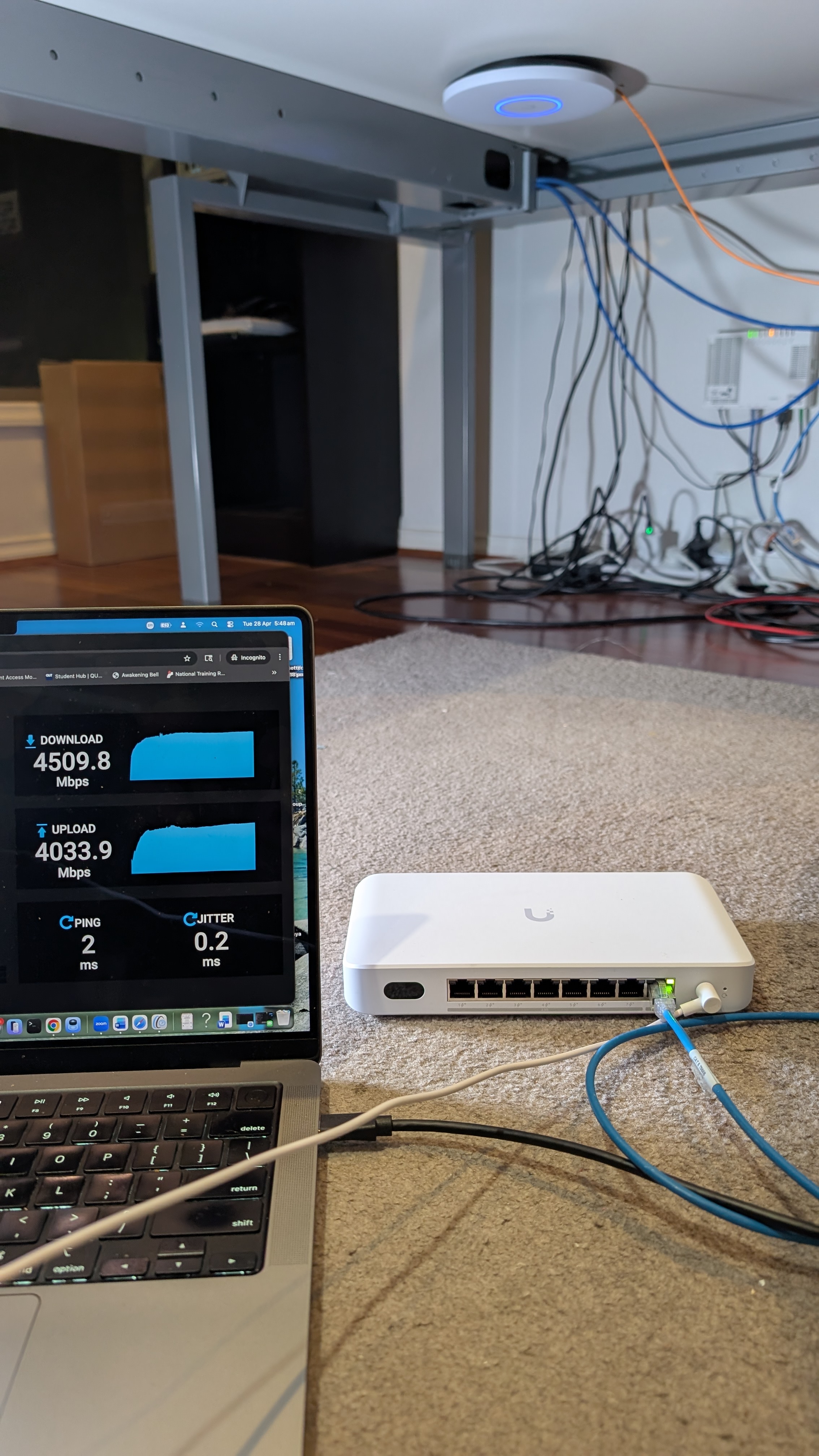 If you’re interested in how my Wi‑Fi 7 home lab is set up and the performance I’m seeing, you can read this blog post. Here is the setup used for this recent test. As shown in the image below, the UDB switch is positioned approximately 1–2 meters away from the access point. I connected my MacBook Pro (M2) via (USB4-to-10 Gbps Ethernet adapter) to the 10 Gbps port of UDB—one of the eight ports supports 10 Gbps, while the remaining ports are 2.5 Gbps.