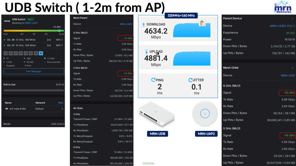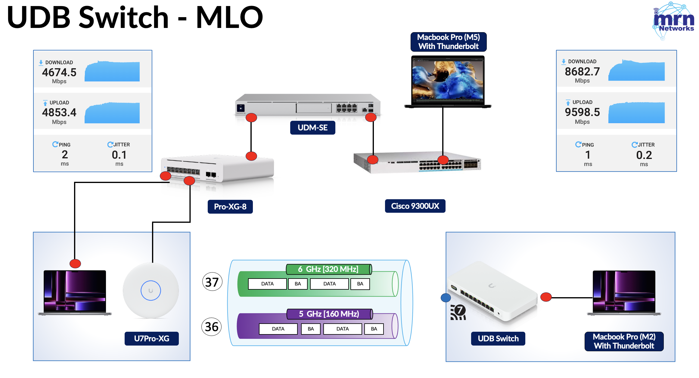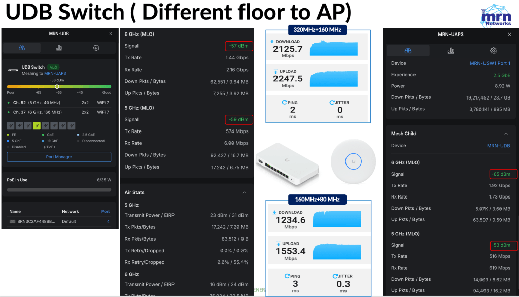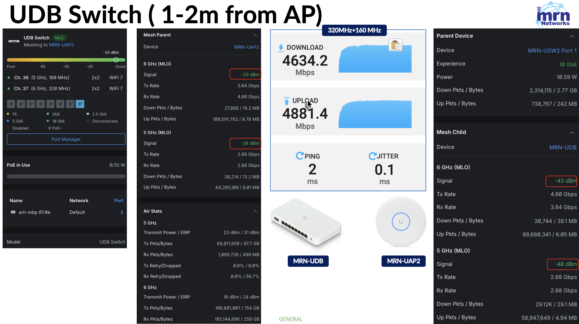 When the UDB switch was downstairs, it delivered over 2 Gbps of throughput with 320 MHz + 160 MHz operation. It achieved around 1.5 Gbps of throughput when operating at 160 MHz + 80 MHz.